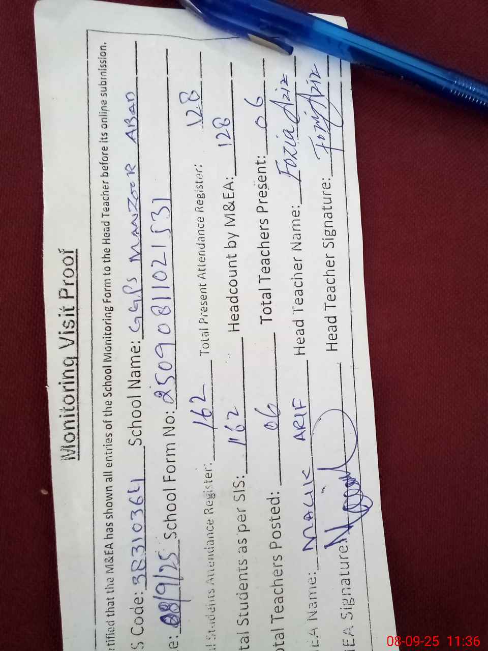 | Attendance Register | Head Teacher | MEA with School | Visit Proof |