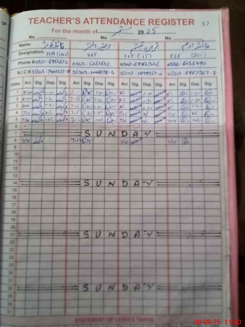 | CNIC | Full Name | Designation | R/C | Absence During Last Calender Month |