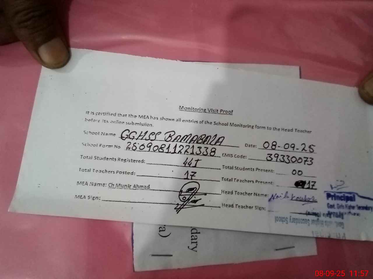 | Attendance Register | Head Teacher | MEA with School | Visit Proof |