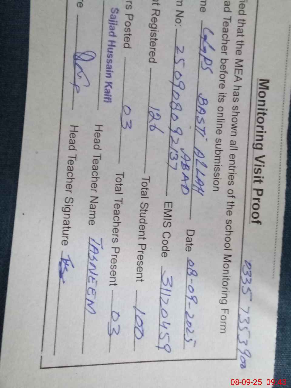 | EMIS Code: 31120459 | Name of School: GGPS BASTI ALLAH ABAD | |||