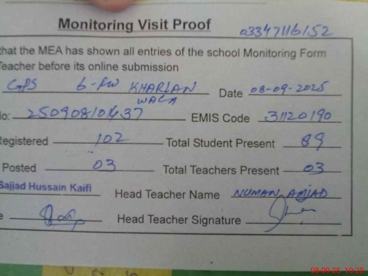 | Attendance Register | Head Teacher | MEA with School | Visit Proof |
