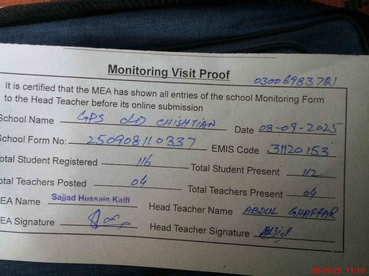 | EMIS Code: 31120153 | Name of School: GPS OLD CHISHTIAN NO. 2 | |||