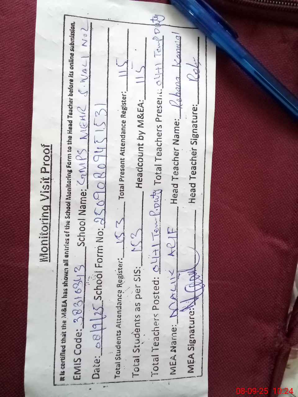 | Attendance Register | Head Teacher | MEA with School | Visit Proof |