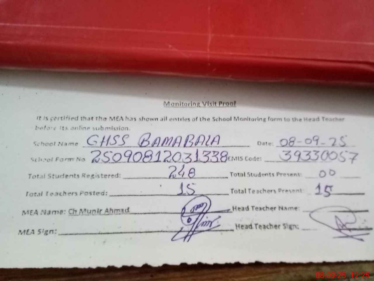 | Attendance Register | Head Teacher | MEA with School | Visit Proof |