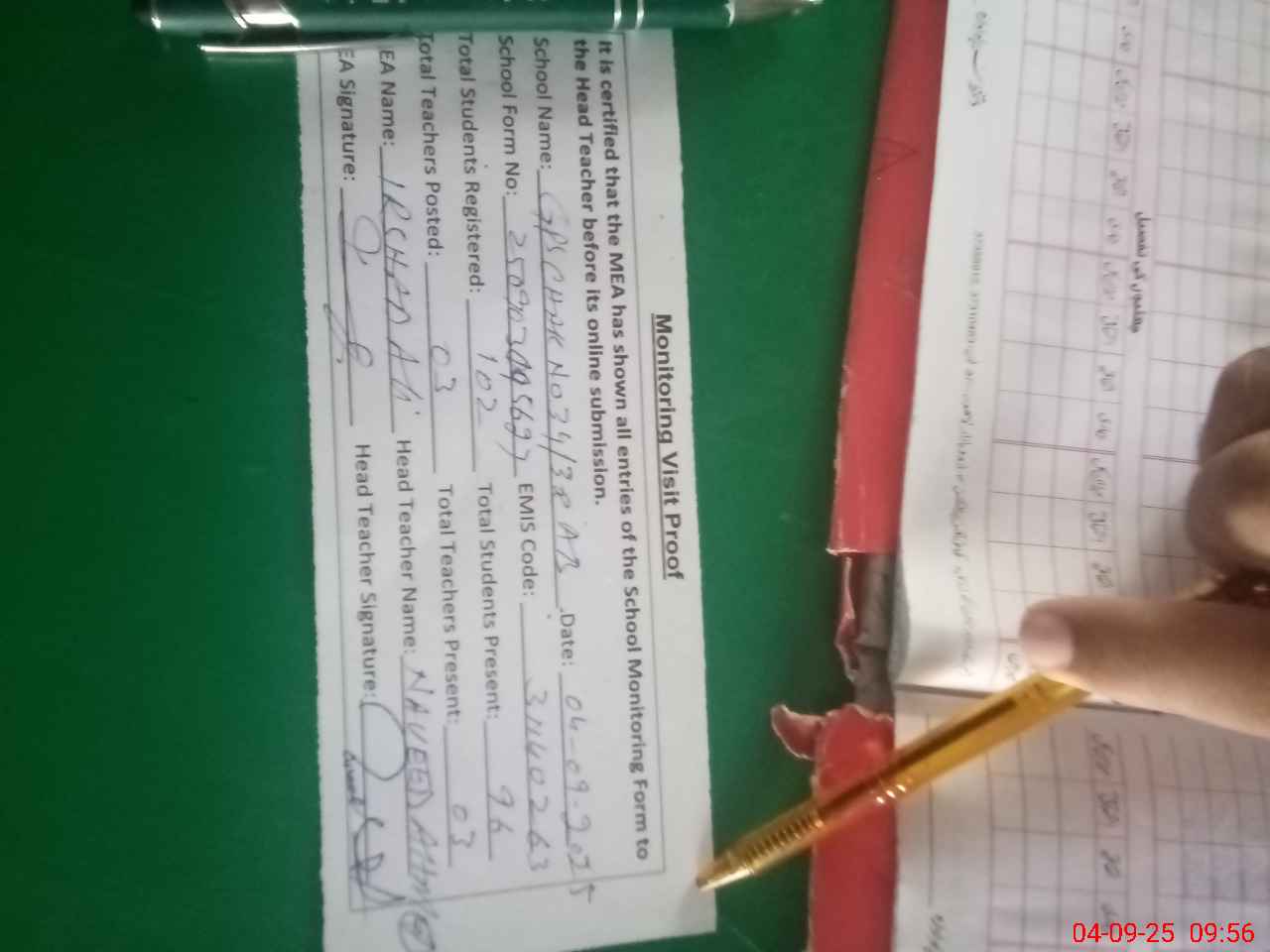 | Attendance Register | Head Teacher | MEA with School | Visit Proof |