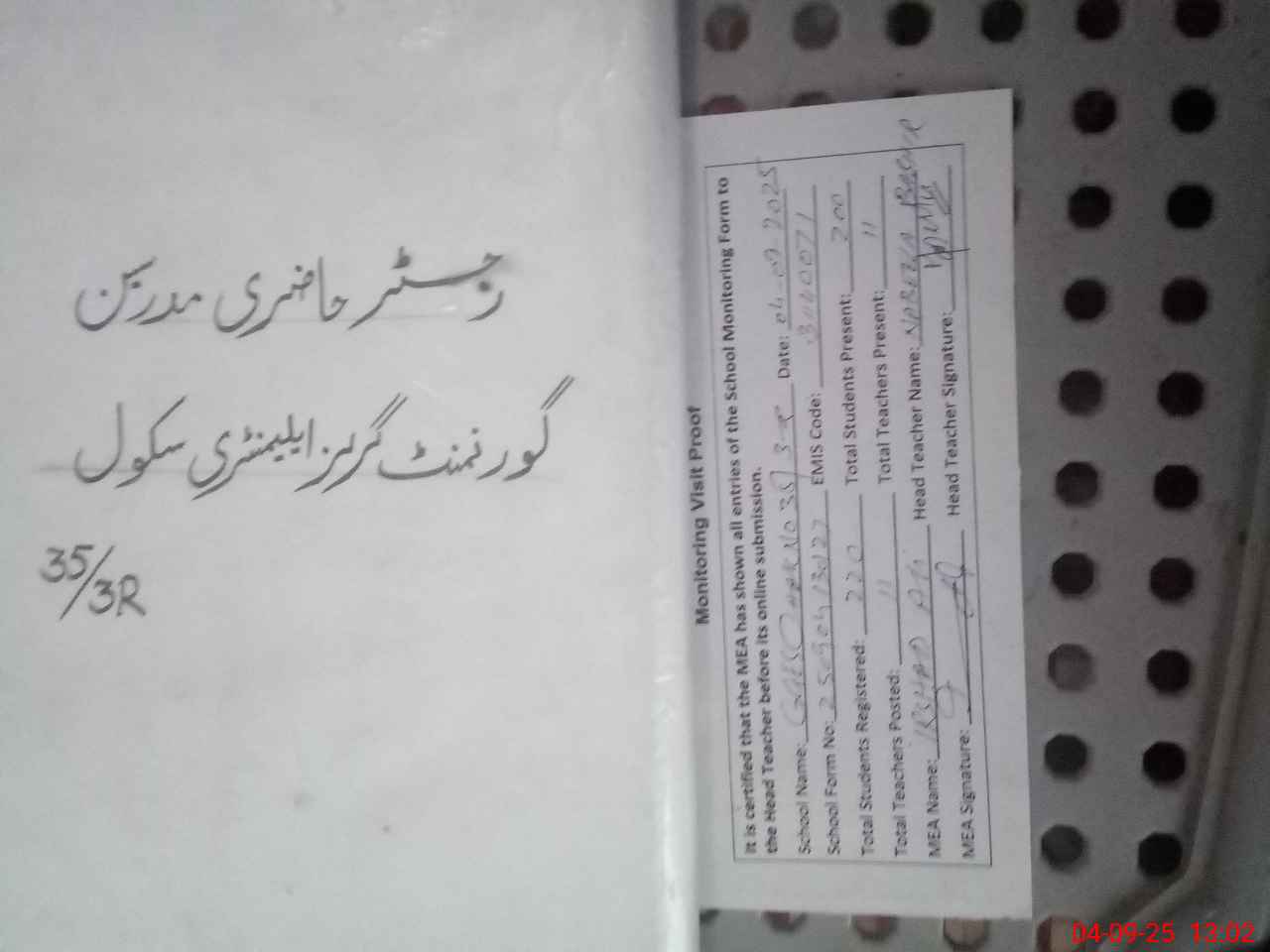 | Attendance Register | Head Teacher | MEA with School | Visit Proof |