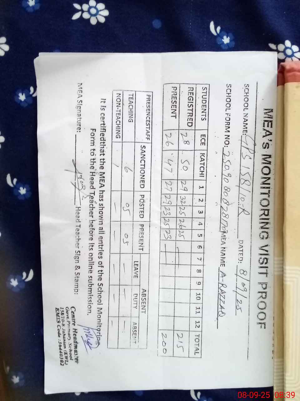 | Attendance Register | Head Teacher | MEA with School | Visit Proof |
