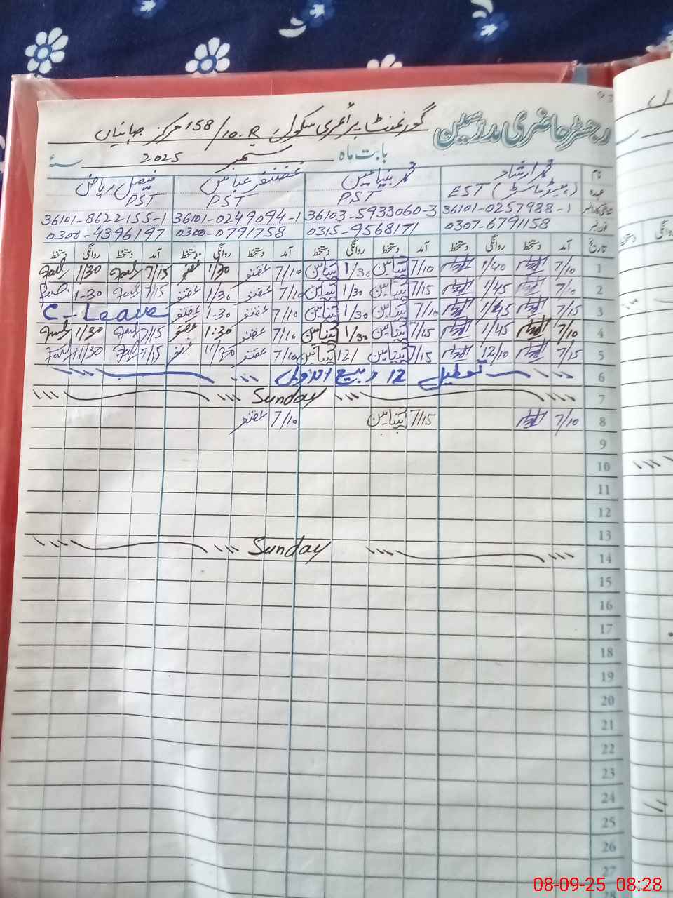 | Name: Mu**** Ir**** Designation: (School Headmaster's/Headmistress's) EST(G) Phone/Cell Number: 03**** |
