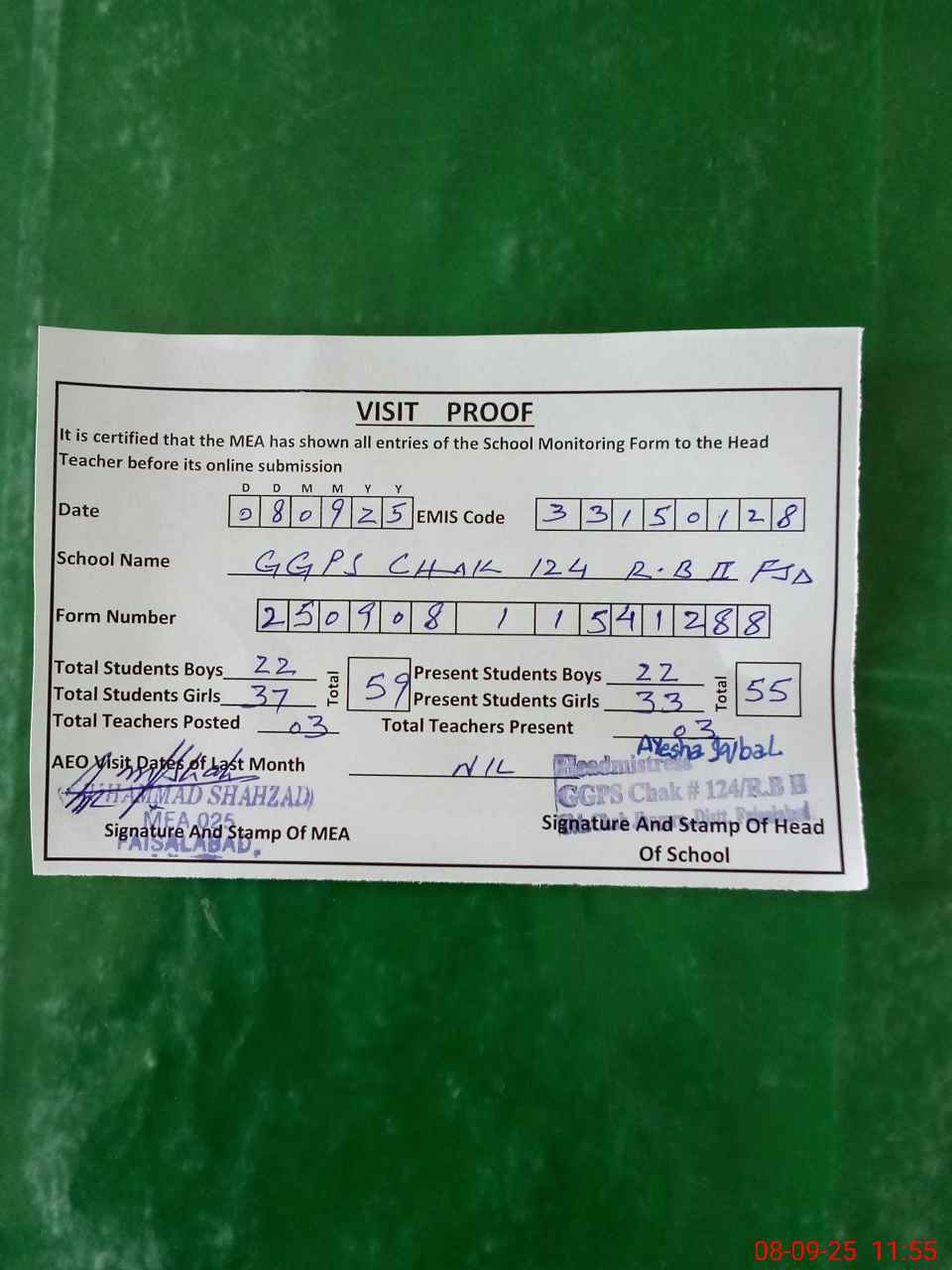 | Attendance Register | Head Teacher | MEA with School | Visit Proof |