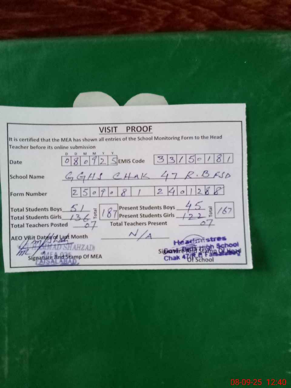 | EMIS Code: 33150181 | Name of School: GGHS CHAK NO 47 RB | |||