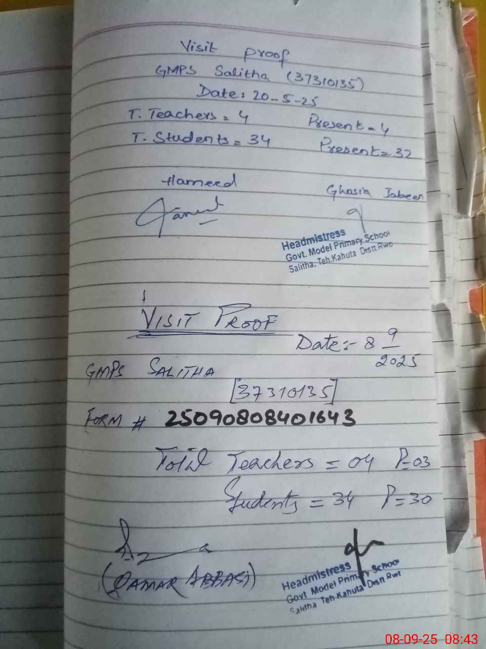 | Attendance Register | Head Teacher | MEA with School | Visit Proof |