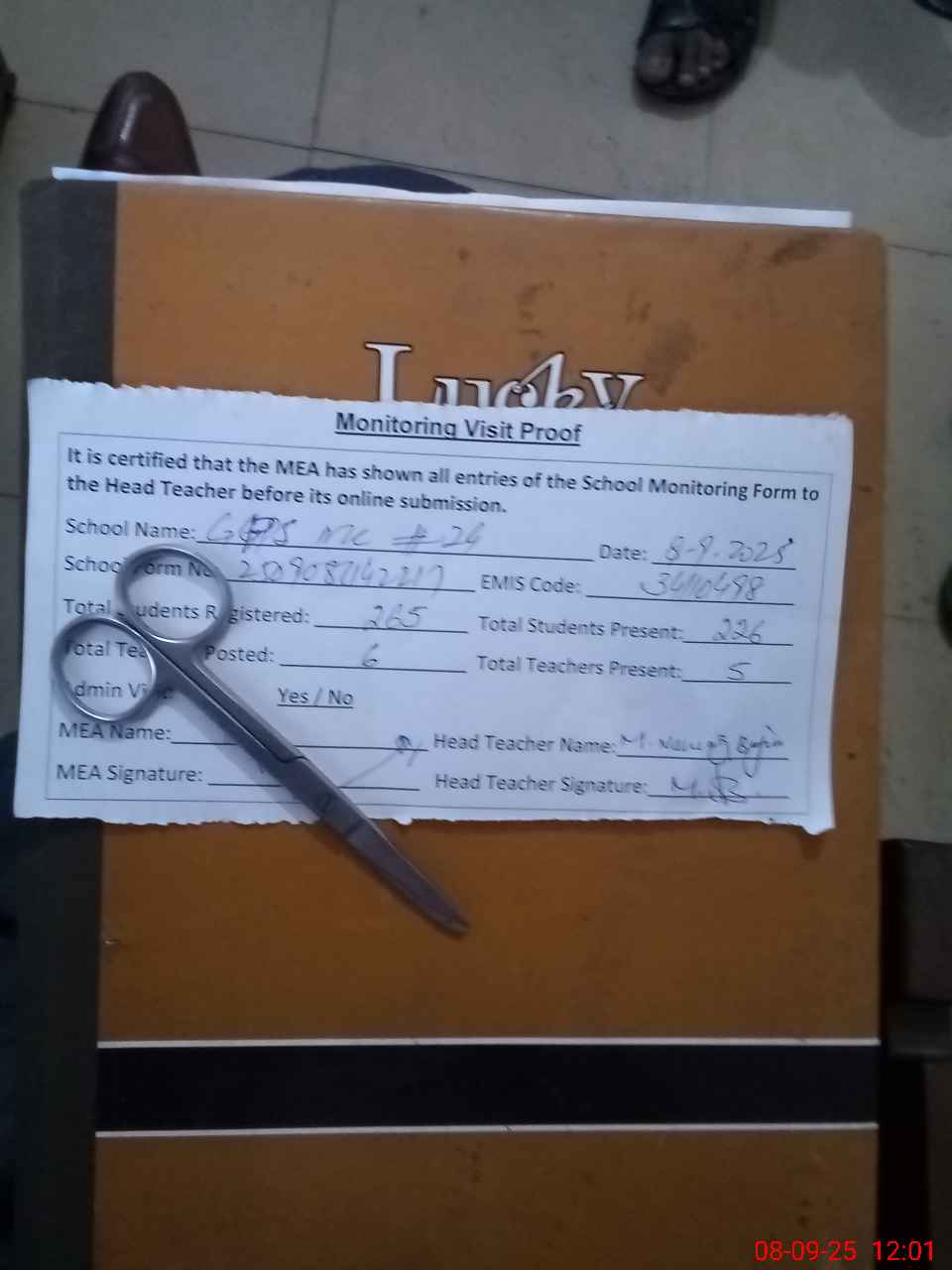 | Attendance Register | Head Teacher | MEA with School | Visit Proof |