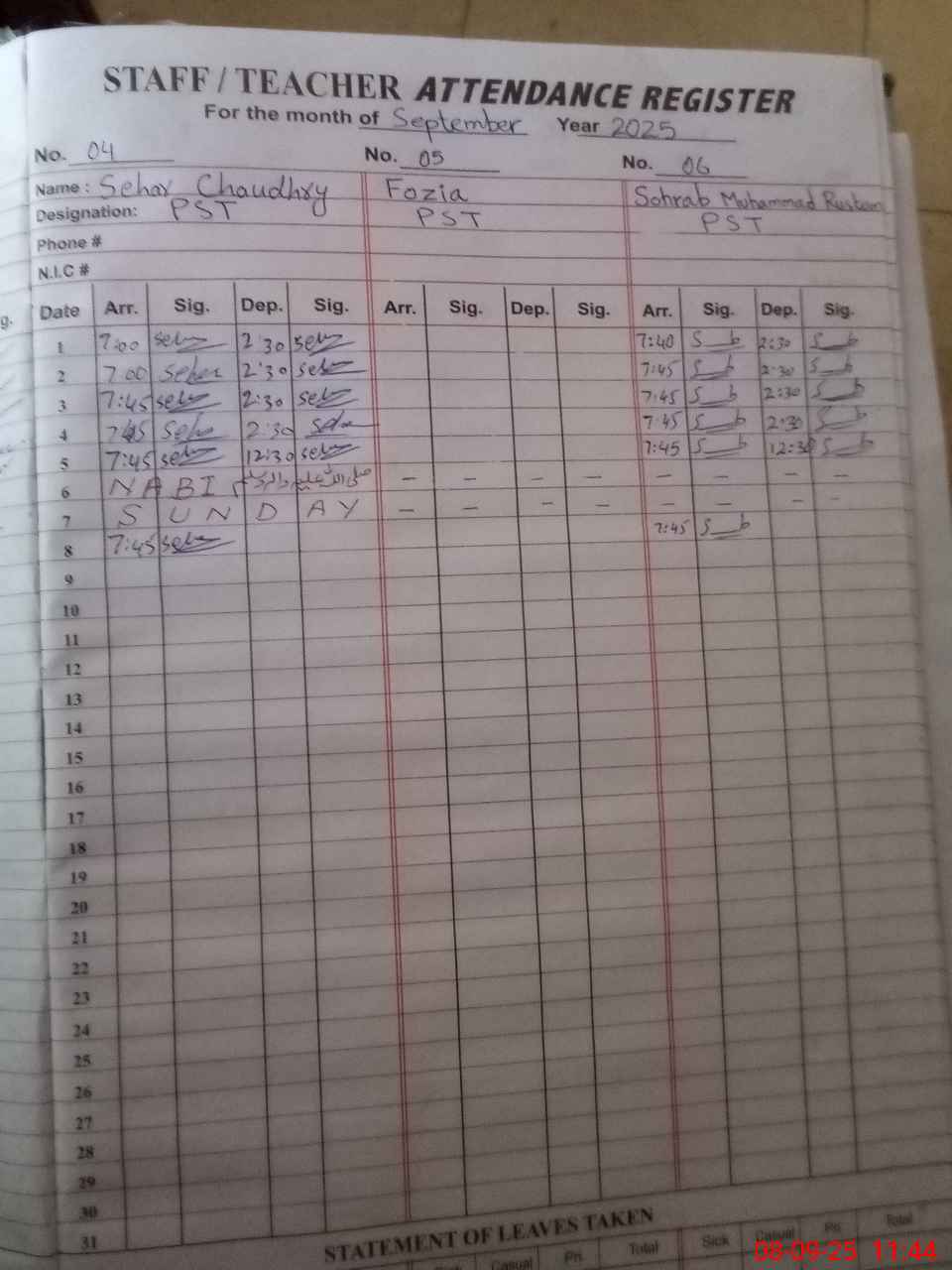 | CNIC | Full Name | Designation | R/C | Absence During Last Calender Month |