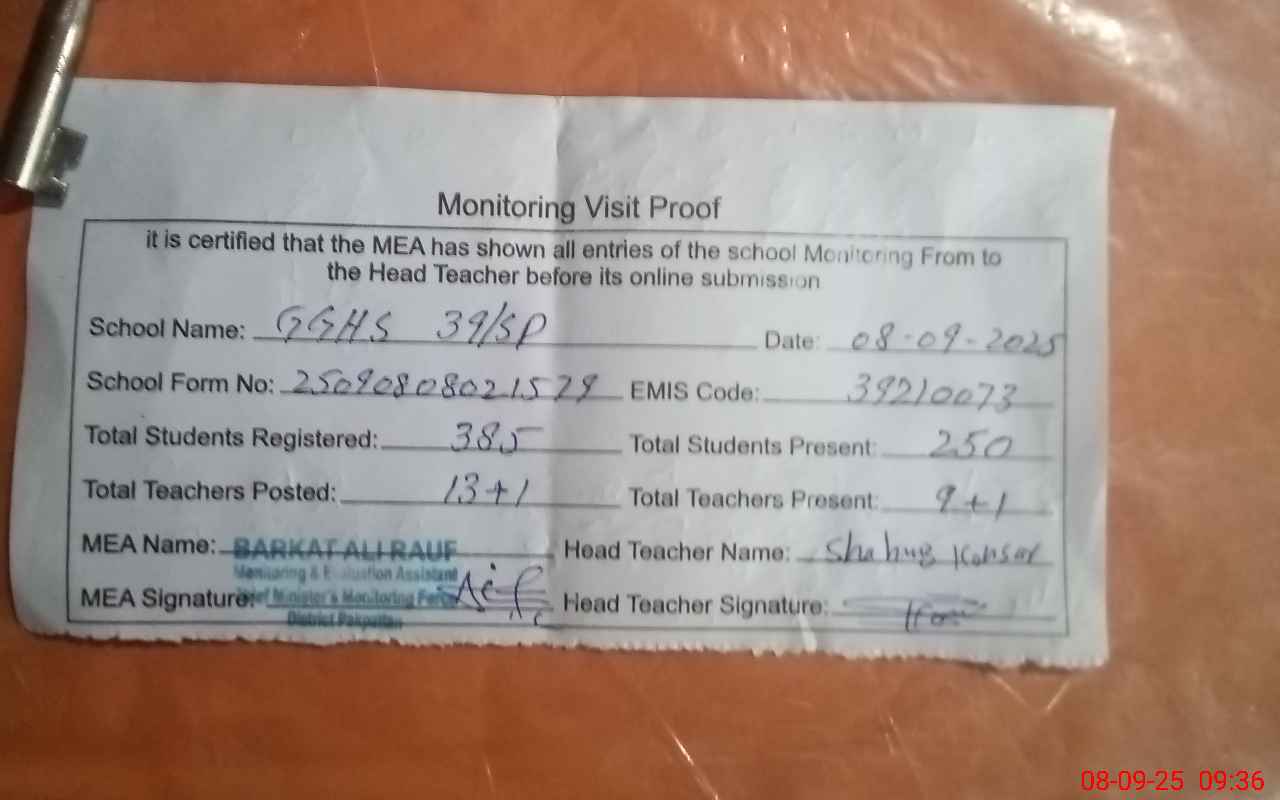 | EMIS Code: 39210073 | Name of School: GGHS CHAK NO.39 SP | |||