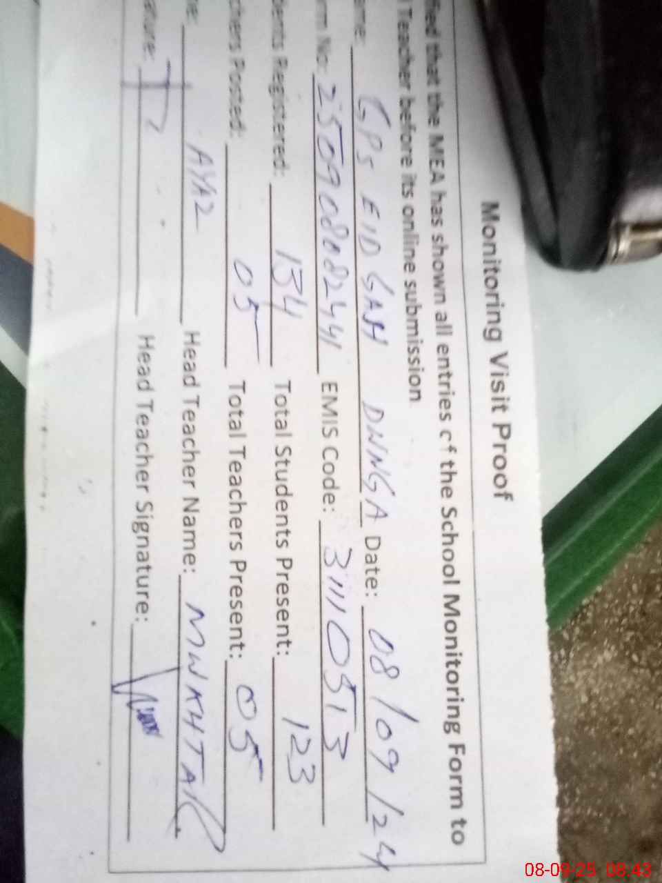 | Attendance Register | Head Teacher | MEA with School | Visit Proof |