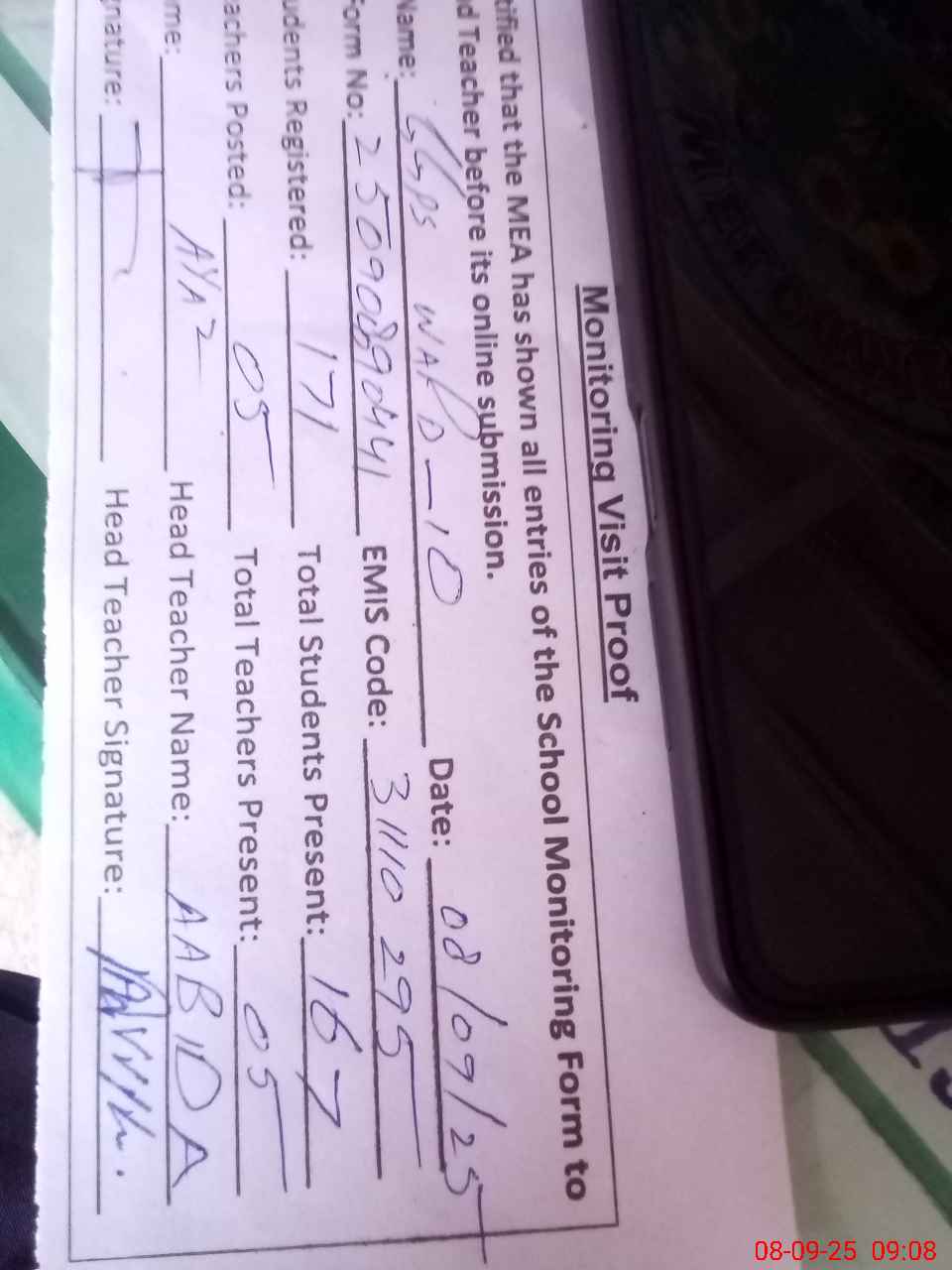 | Attendance Register | Head Teacher | MEA with School | Visit Proof |