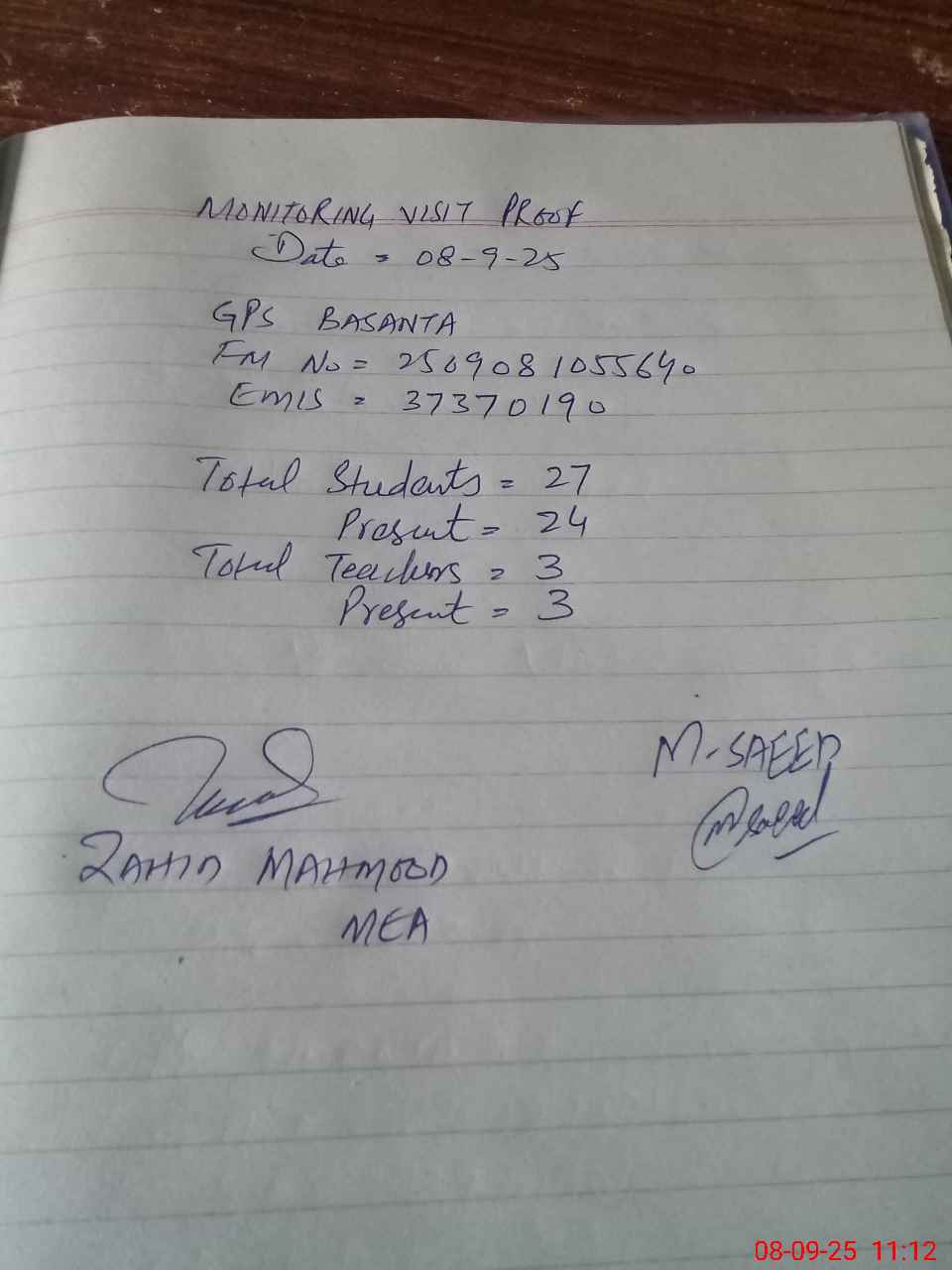 | Monitoring Date: 08-09-2025 | Start Time: 08-09-2025 10:51 AM | End Time: 08-09-2025 11:14 AM | Name of MEA: Za**** Me**** | |