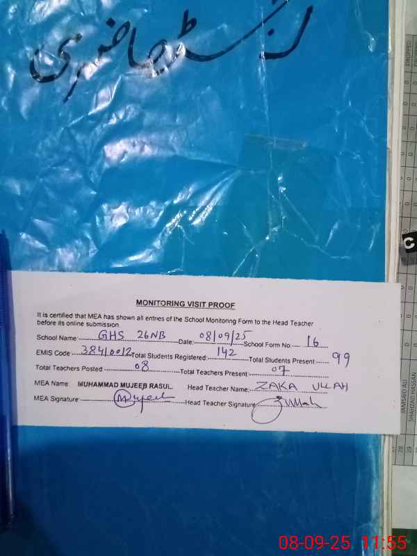 | EMIS Code: 38410012 | Name of School: GHS CHAK NO.26 NB | |||