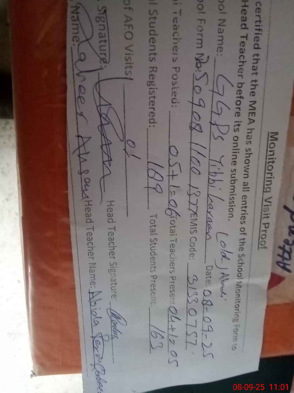 | Attendance Register | Head Teacher | MEA with School | Visit Proof |