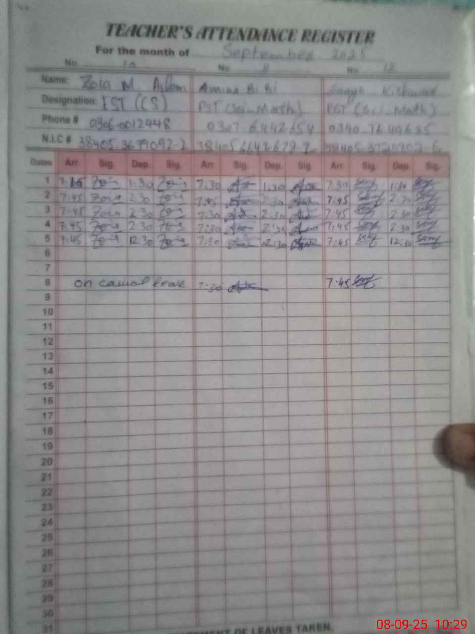 | CNIC | Full Name | Designation | R/C | Absence during last cal. month |
