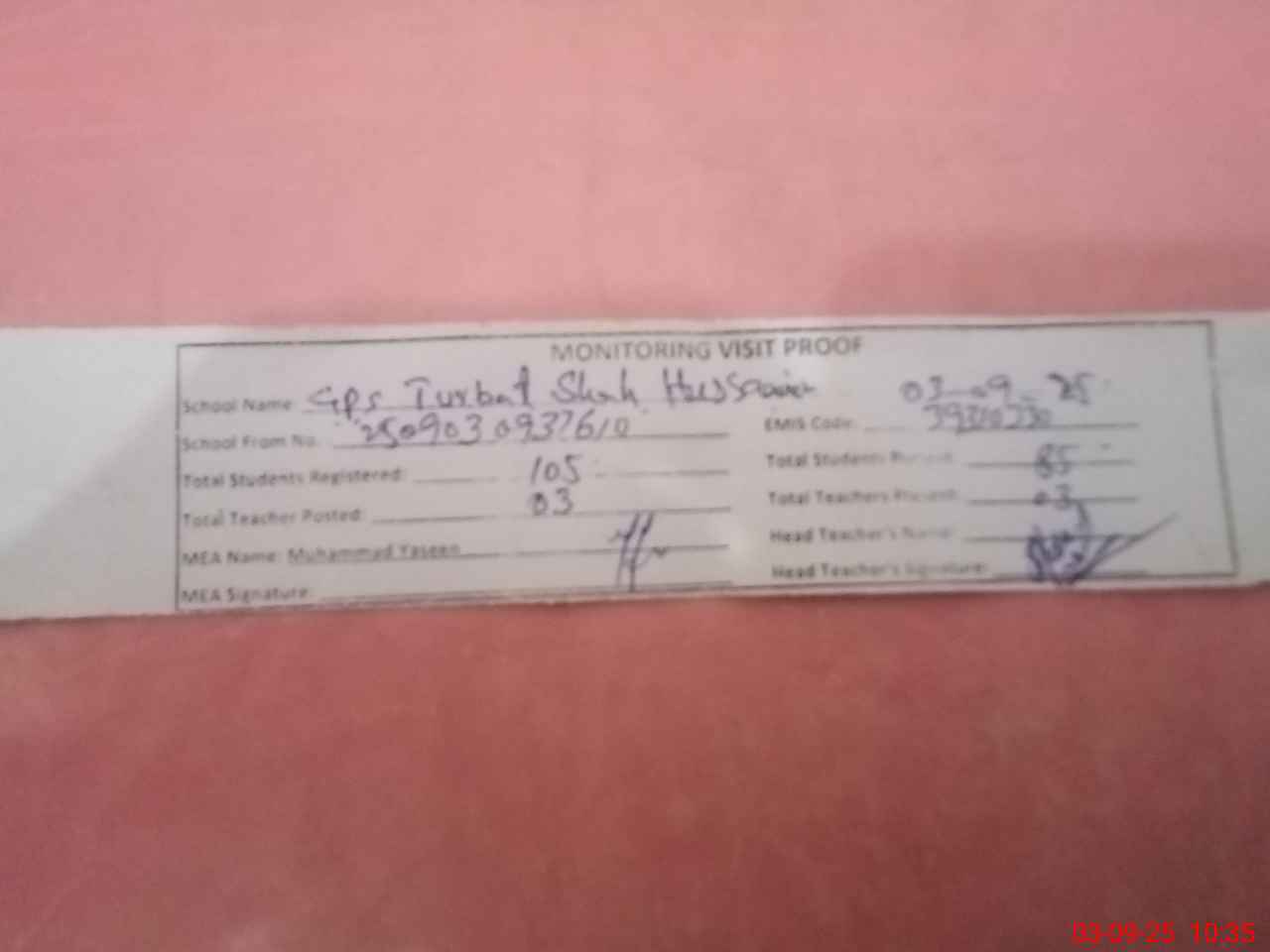 | Attendance Register | Head Teacher | MEA with School | Visit Proof |