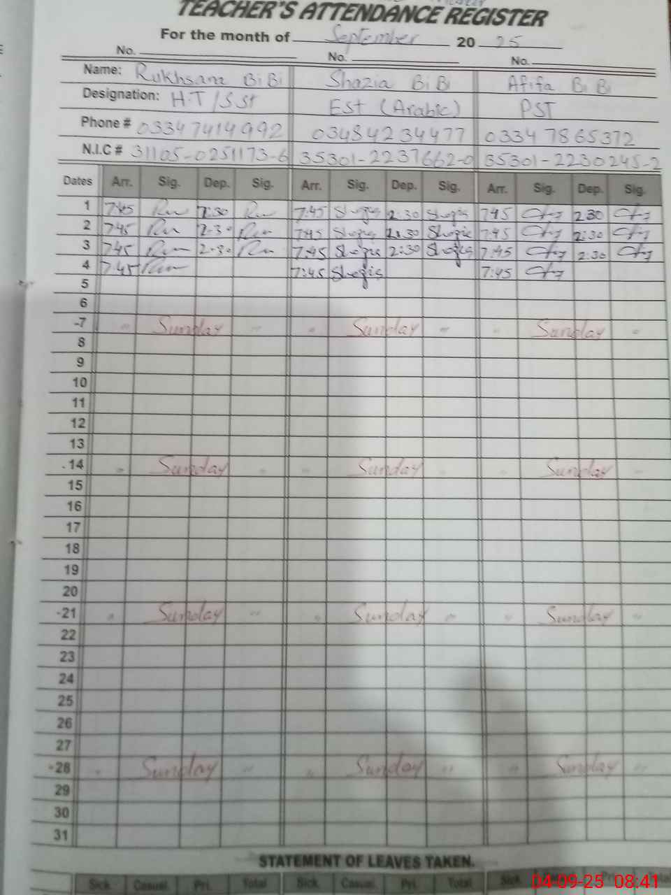 | CNIC | Full Name | Designation | R/C | Absence During Last Calender Month |