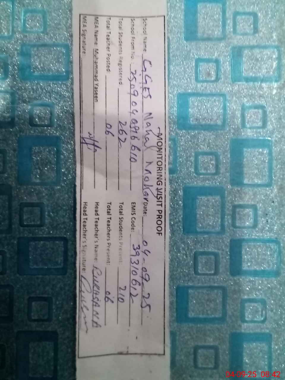 | Attendance Register | Head Teacher | MEA with School | Visit Proof |