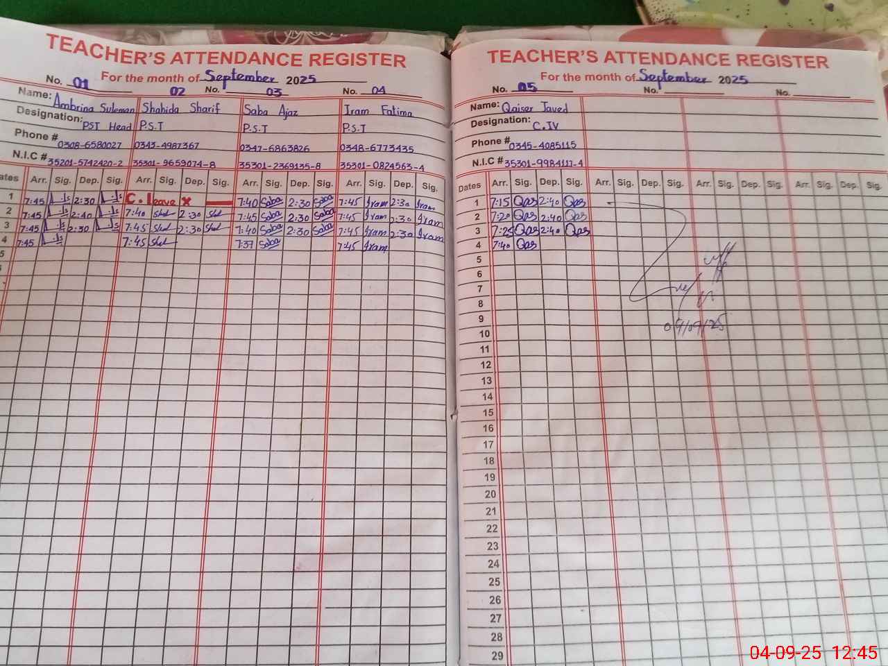 | CNIC | Full Name | Designation | R/C | Absence During Last Calender Month |
