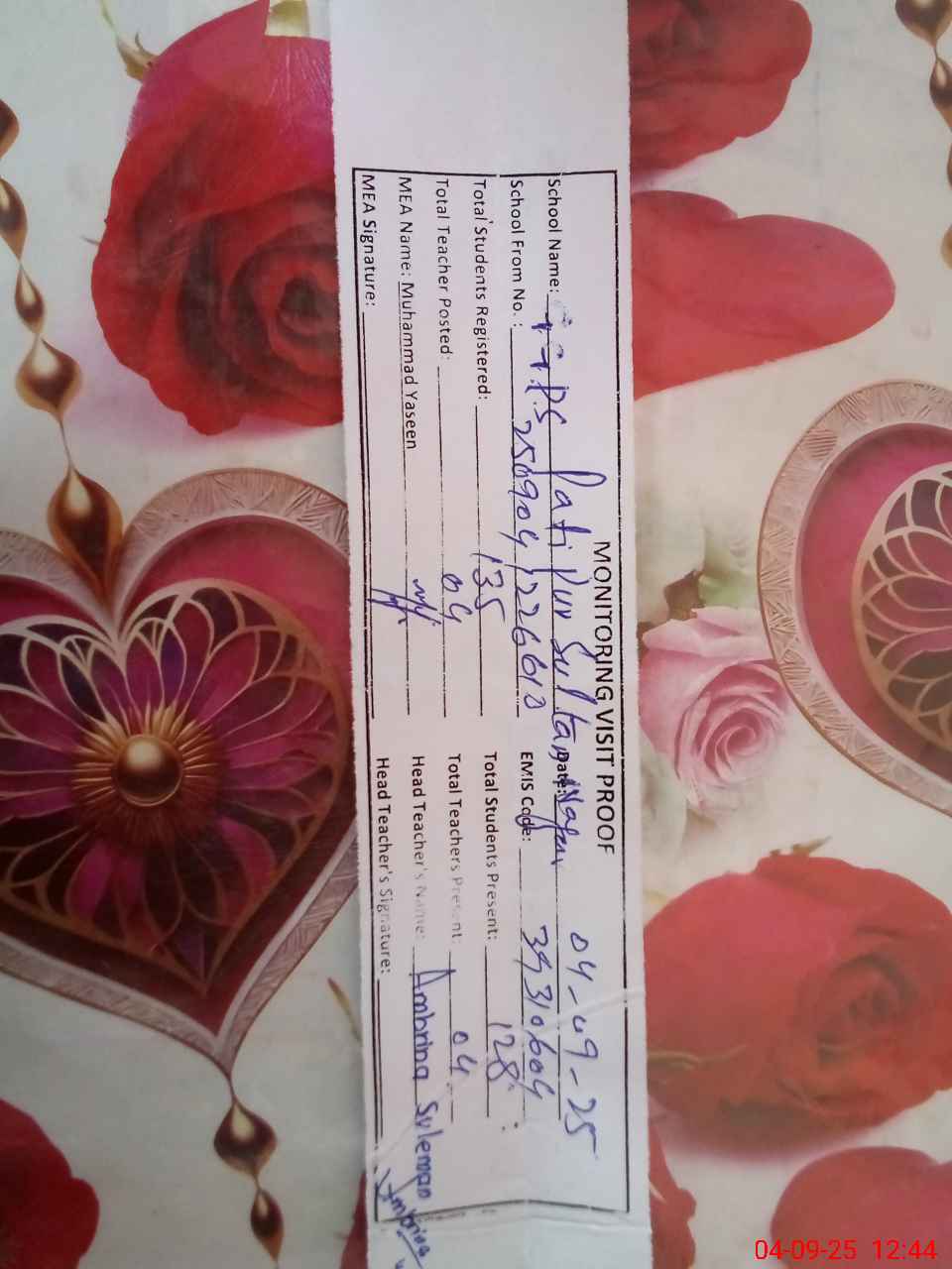 | Attendance Register | Head Teacher | MEA with School | Visit Proof |