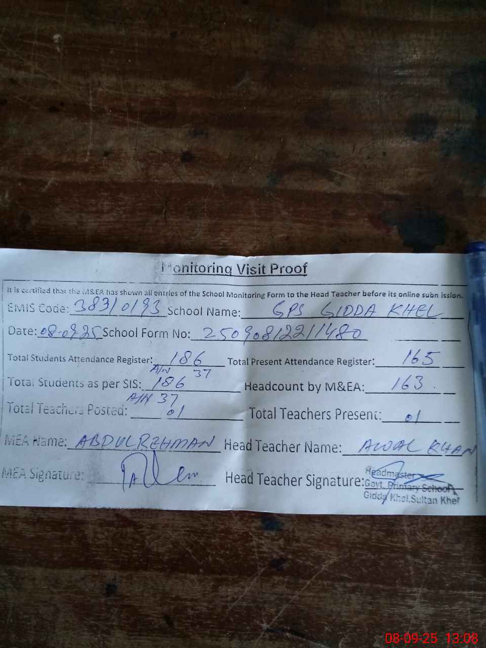 | EMIS Code: 38310193 | Name of School: GPS GIDDA KHEL | |||