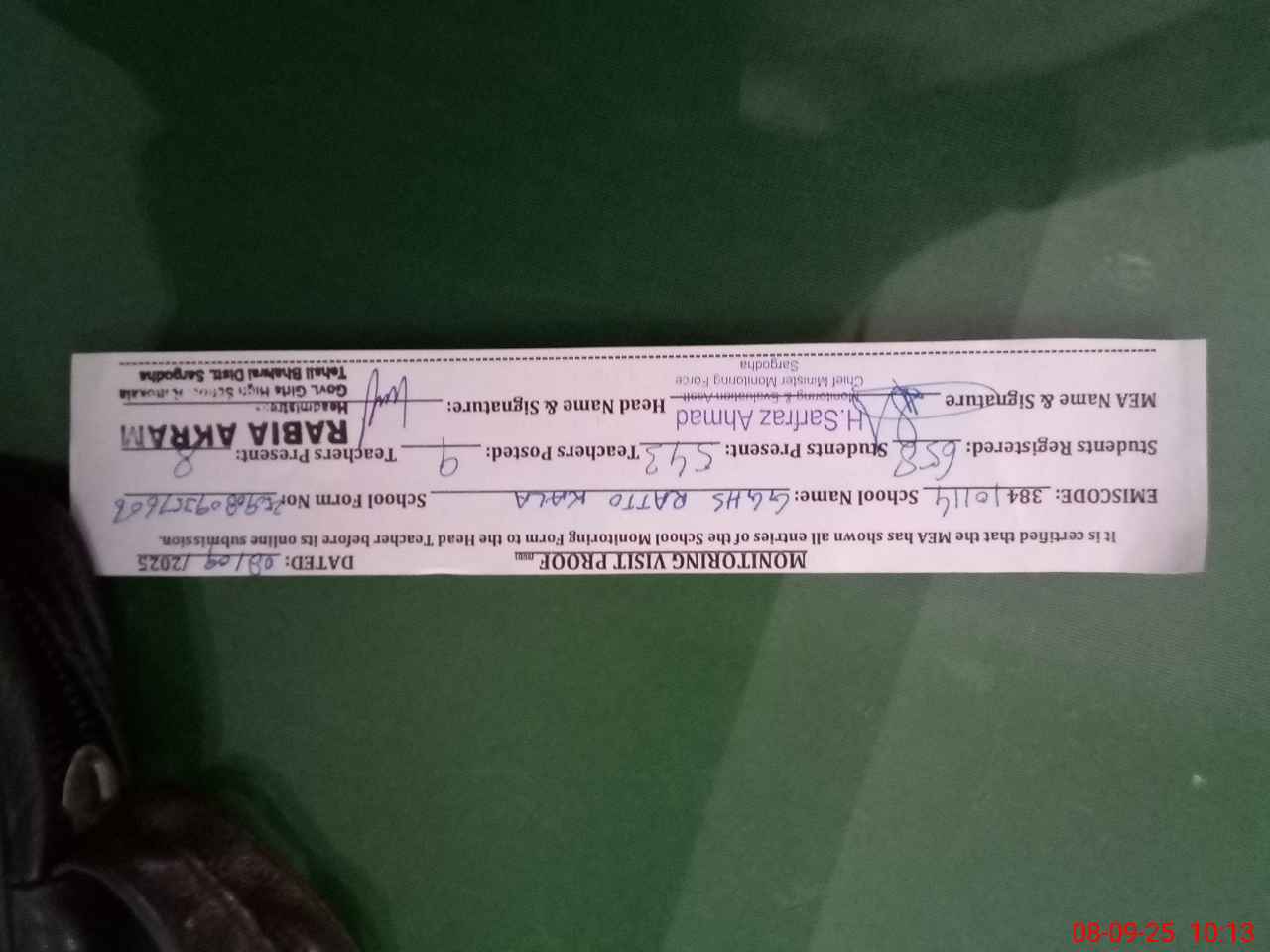 | Monitoring Date: 08-09-2025 | Start Time: 08-09-2025 09:35 AM | End Time: 08-09-2025 10:14 AM | Name of MEA: HA**** SA**** AH**** | |