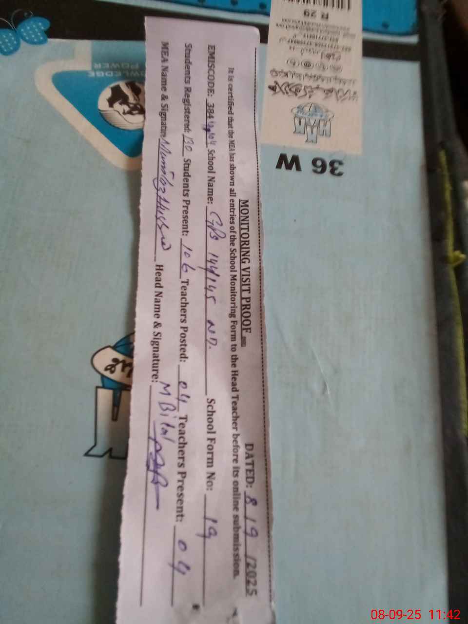 | Attendance Register | Head Teacher | MEA with School | Visit Proof |