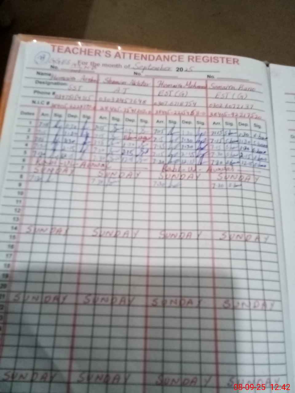 | CNIC | Full Name | Designation | R/C | Absence During Last Calender Month |