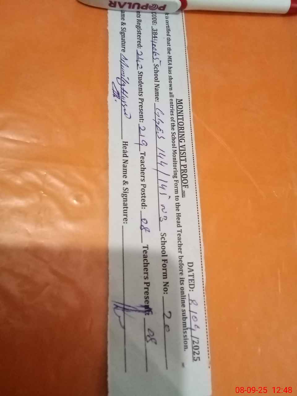| Attendance Register | Head Teacher | MEA with School | Visit Proof |