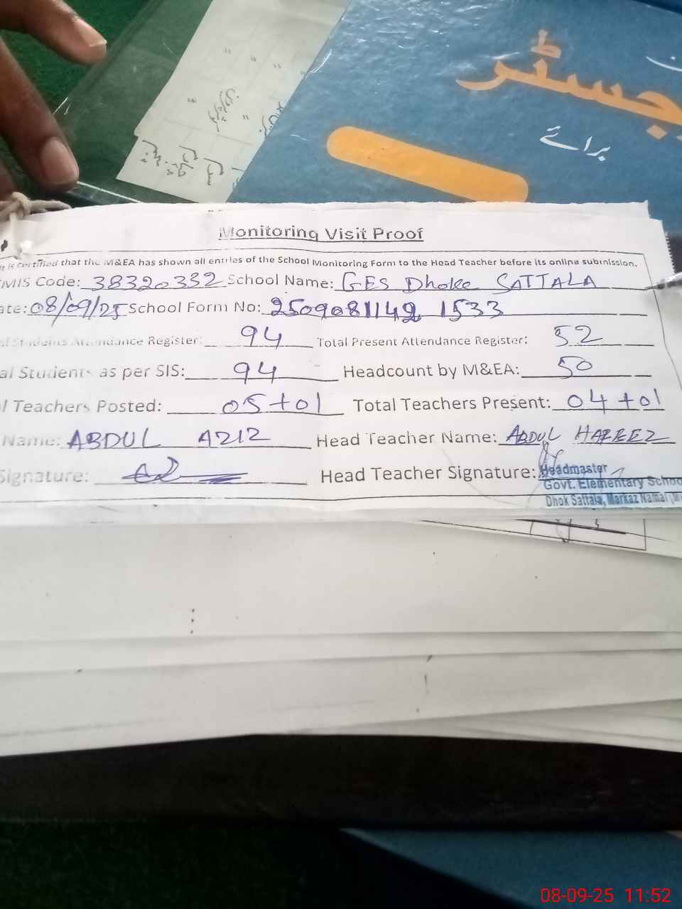 | Attendance Register | Head Teacher | MEA with School | Visit Proof |
