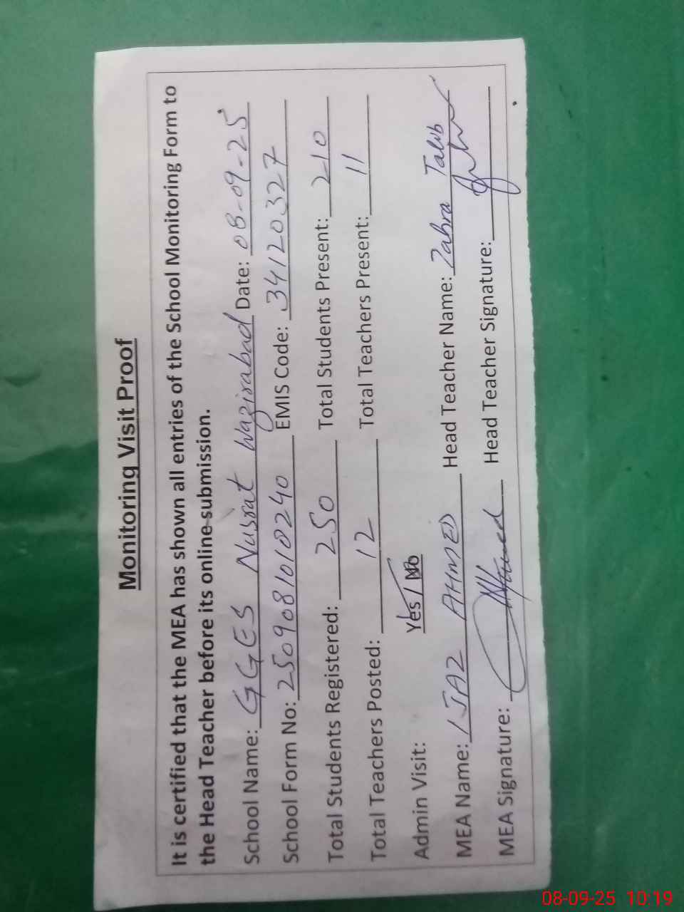 | EMIS Code: 34120327 | Name of School: GGES NUSRAT WAZIRABAD | |||