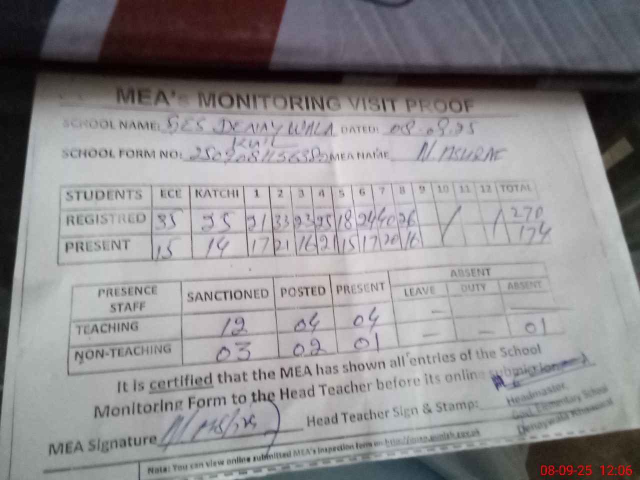 | Attendance Register | Head Teacher | MEA with School | Visit Proof |