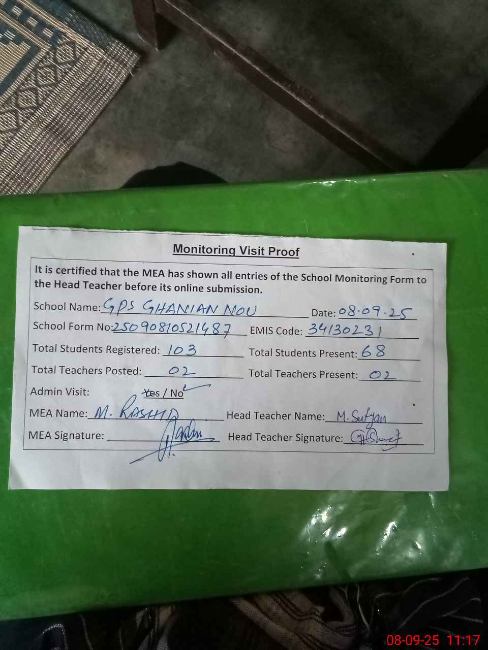 | Attendance Register | Head Teacher | MEA with School | Visit Proof |