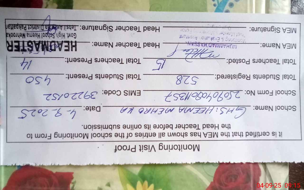 | Attendance Register | Head Teacher | MEA with School | Visit Proof |
