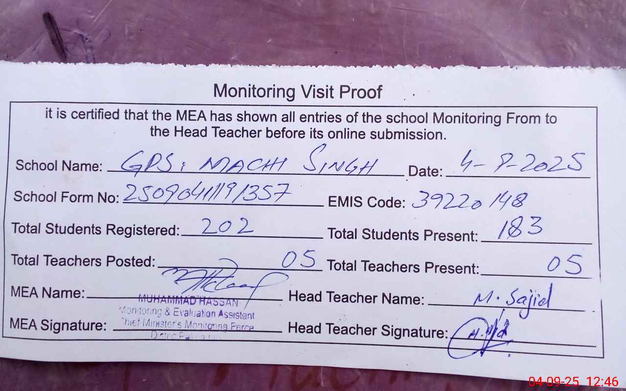 | EMIS Code: 39220148 | Name of School: GPS MACHHI SINGH | |||