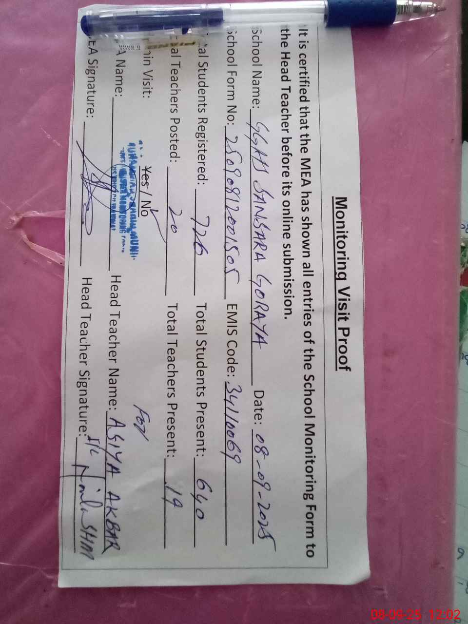 | Attendance Register | Head Teacher | MEA with School | Visit Proof |