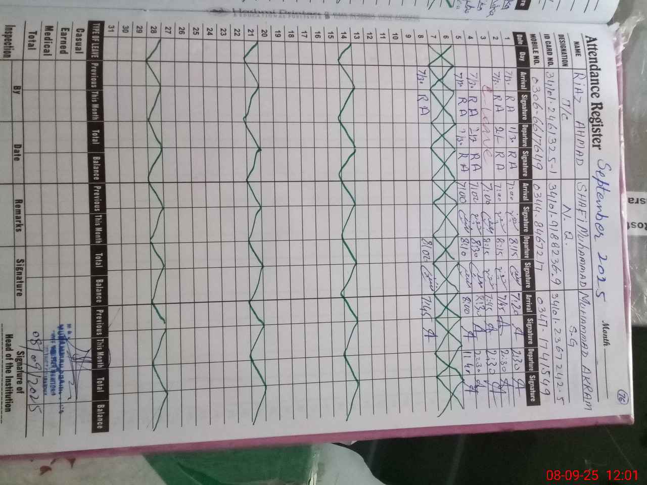 | CNIC | Full Name | Designation | R/C | Absence during last cal. month |