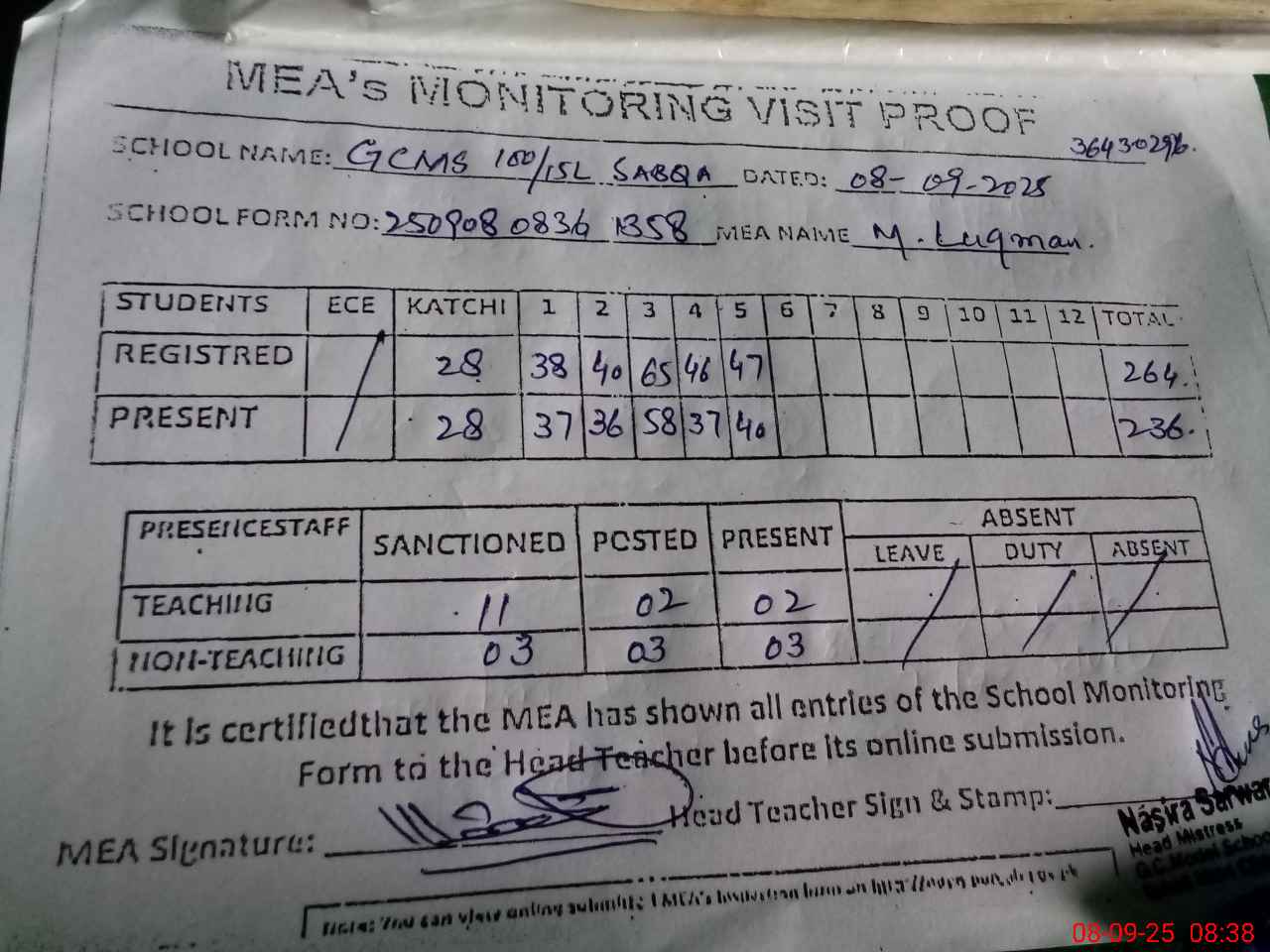 | Attendance Register | Head Teacher | MEA with School | Visit Proof |