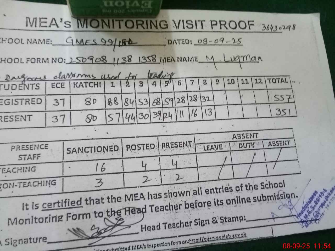 | Attendance Register | Head Teacher | MEA with School | Visit Proof |