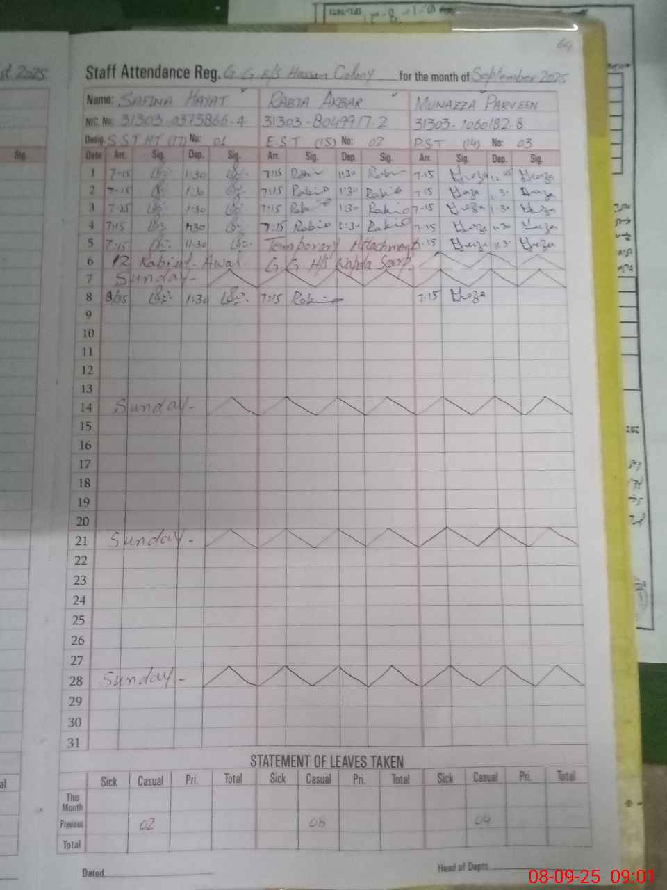 | CNIC | Full Name | Designation | R/C | Absence During Last Calender Month |