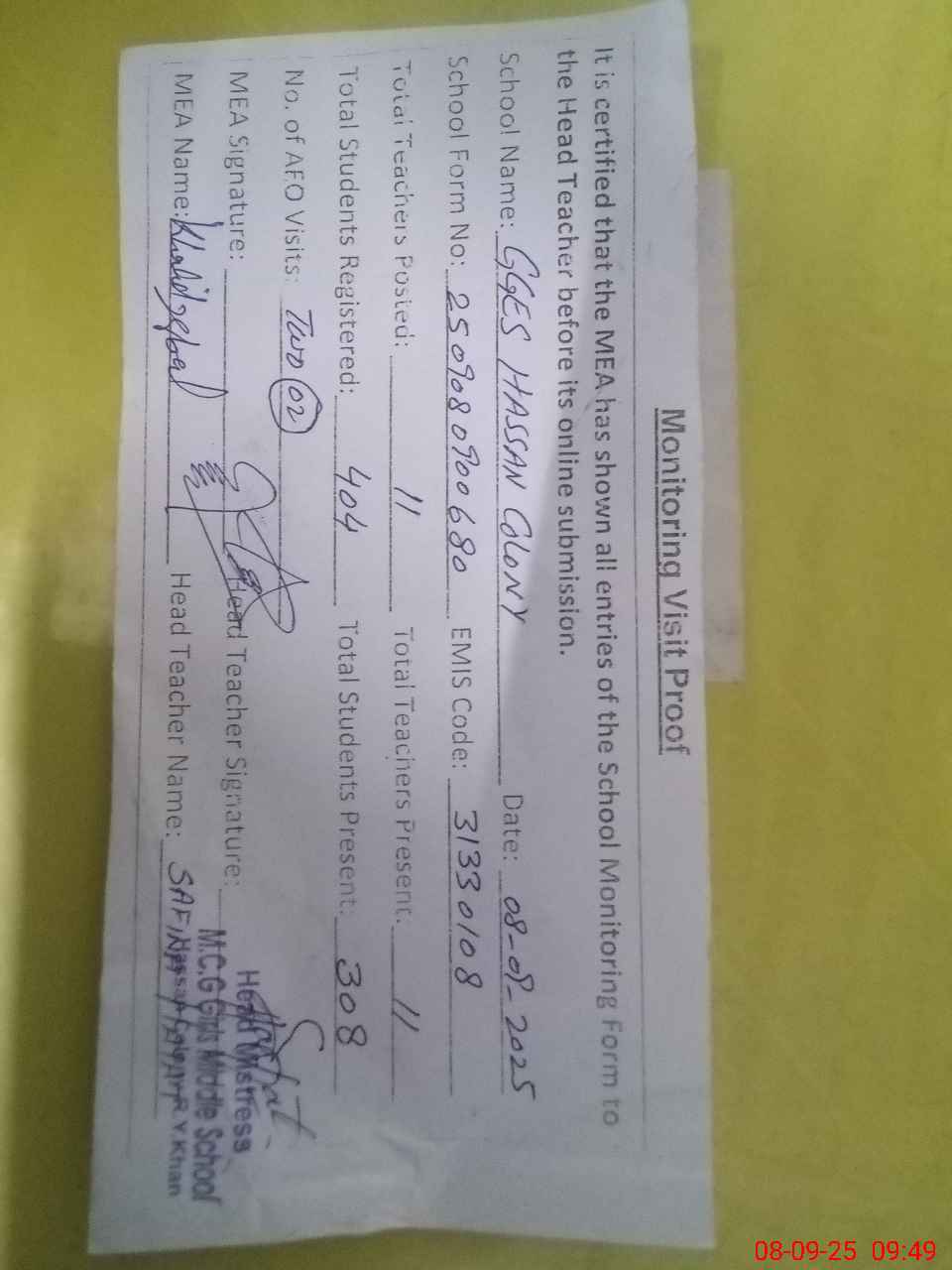 | Attendance Register | Head Teacher | MEA with School | Visit Proof |