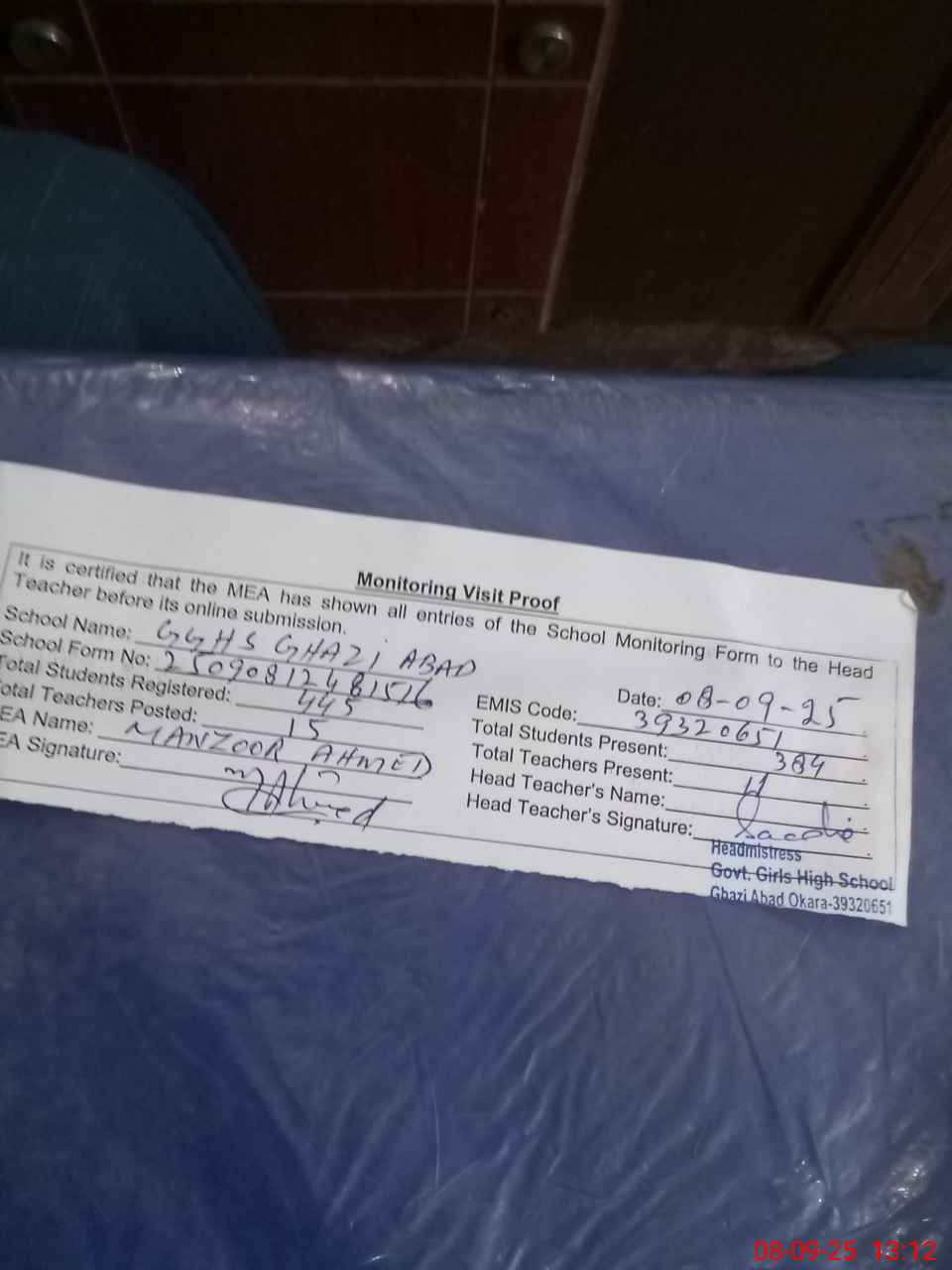| Attendance Register | Head Teacher | MEA with School | Visit Proof |