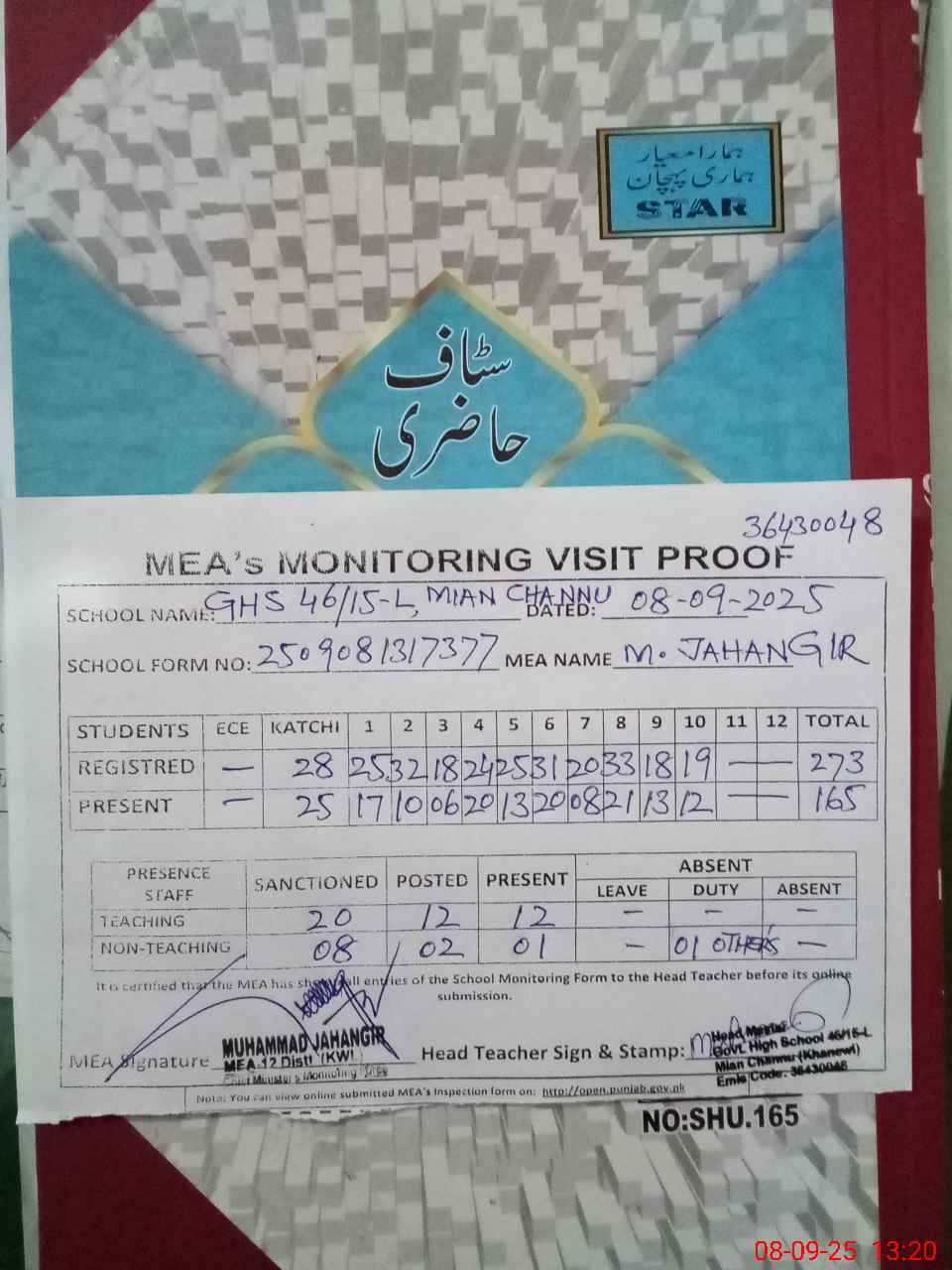 | Attendance Register | Head Teacher | MEA with School | Visit Proof |