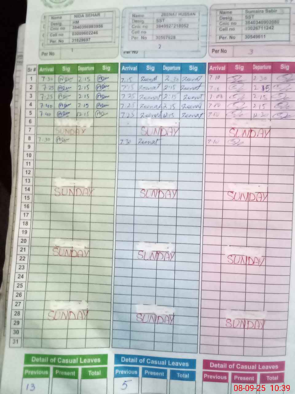 | CNIC | Full Name | Designation | R/C | Absence during last cal. month |