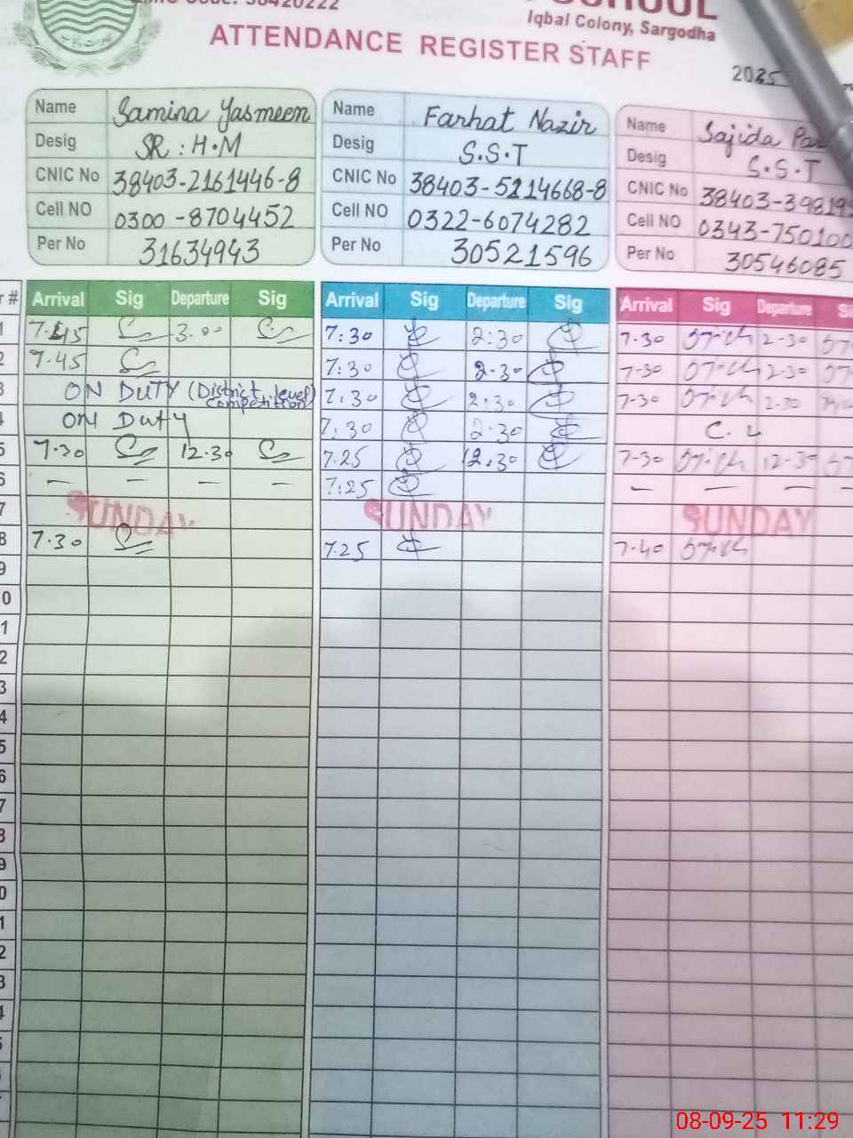 | CNIC | Full Name | Designation | R/C | Absence during last cal. month |